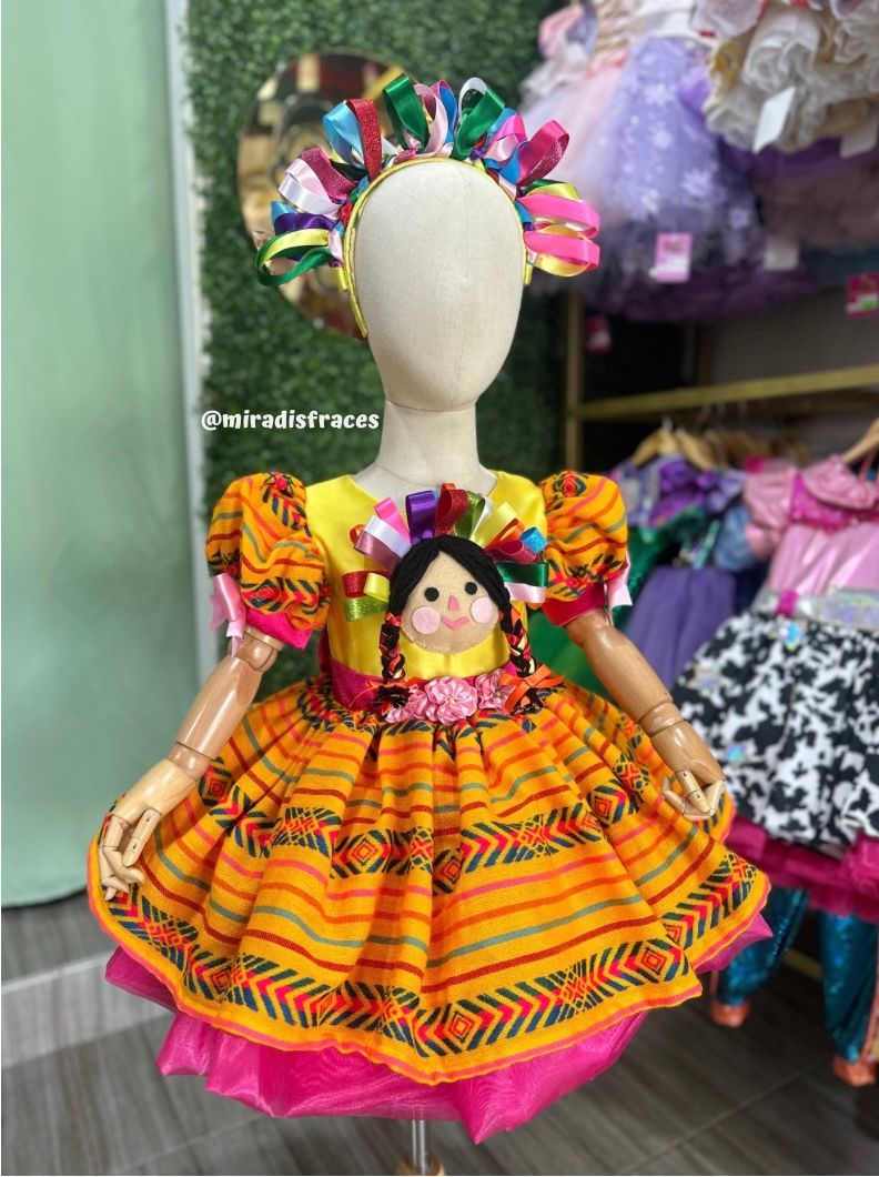 La tradicional muñequita artesanal tiene un modelo en nuestro catálogo, este vestido corto y colorido con diseño tipo textil y con la típica diadema de listones.